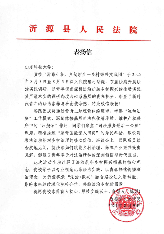 近日,沂源縣團委和沂源縣人民法院向我校發(fā)來表揚信,對校區(qū)2025年暑期三下鄉(xiāng)團隊“沂路生花,鄉(xiāng)韻新生——鄉(xiāng)村振興實踐團”在地方開展的系列實踐活動給予高度肯定與感謝,并期待日后持續(xù)深化校地交流合作。