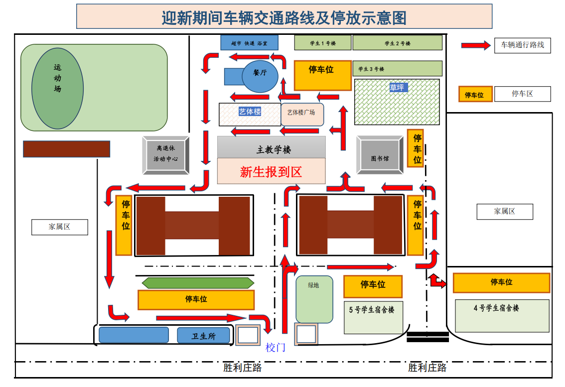 一、迎新期間,送新生的車輛憑入學通知書進入校園,每名新生限一輛機動車進校,憑2025年新生報到免費停車券免停車費。車輛進校后應緩速安全行駛并按照現場工作人員指揮有序停放(后附校園交通路線及停放示意圖)。因校內停車資源有限,請送完學生家長及時將車輛駛離。