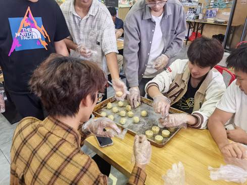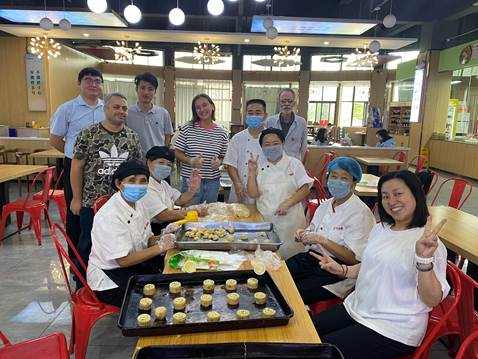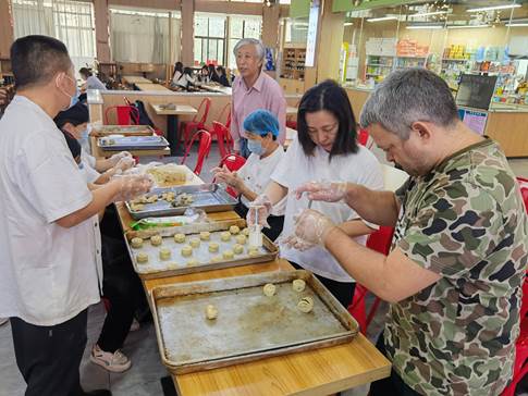 在活動的現(xiàn)場,經(jīng)過食堂專業(yè)師傅的細心指導(dǎo),餐廳員工與外教、學(xué)生親切交流,傳授制作月餅的方法與技巧,在知道自己包下的月餅會發(fā)放到每一個同學(xué)的手中,大家更是干勁十足。
