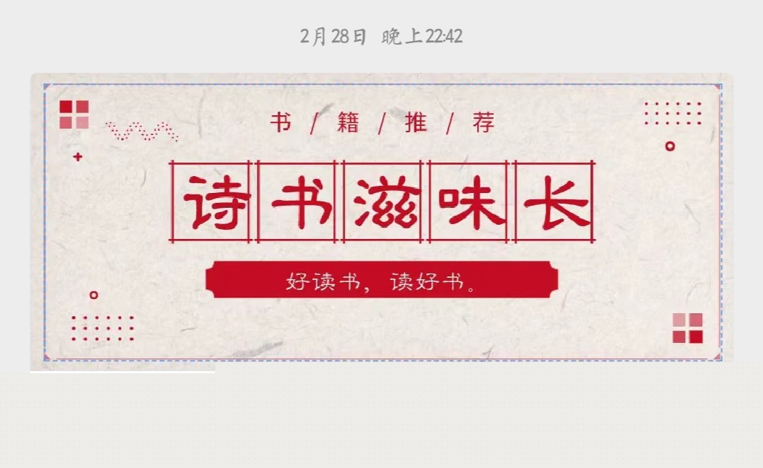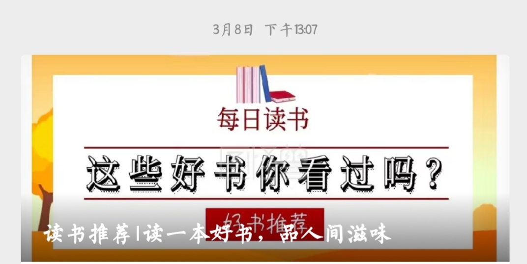 書籍是橫渡時間大海的航船。校區(qū)學生會借助網絡開放文庫和自有圖書,依托微信公眾號開設“讀書推薦”專欄,每周推送名著導讀,并附上在線閱讀鏈接,方便學生線上閱讀。