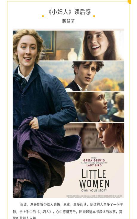 慈慧函同學從“樂觀、自立”的角度分享了《小婦人》的感悟。幸運的人一生都被童年治愈,不幸的人一生都在治愈童年,而馬奇太太造就她的四個女兒一生的幸運,讓我們看到了溫暖善良自立自強的小婦人,領悟到了馬奇夫人一家樂觀的心態(tài)和勇于付出的精神。