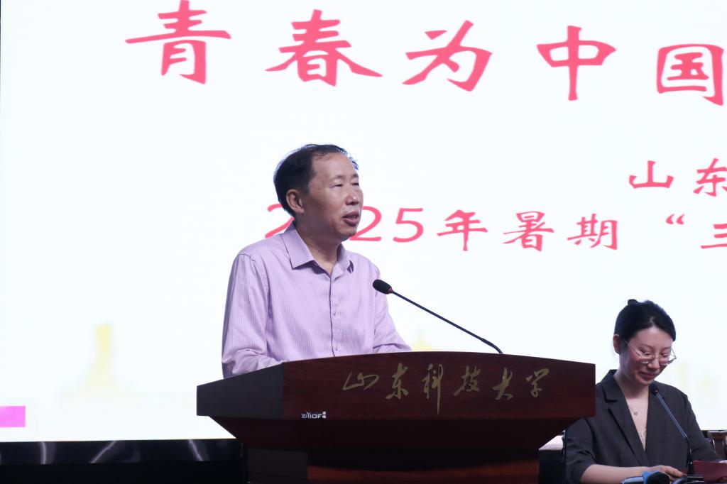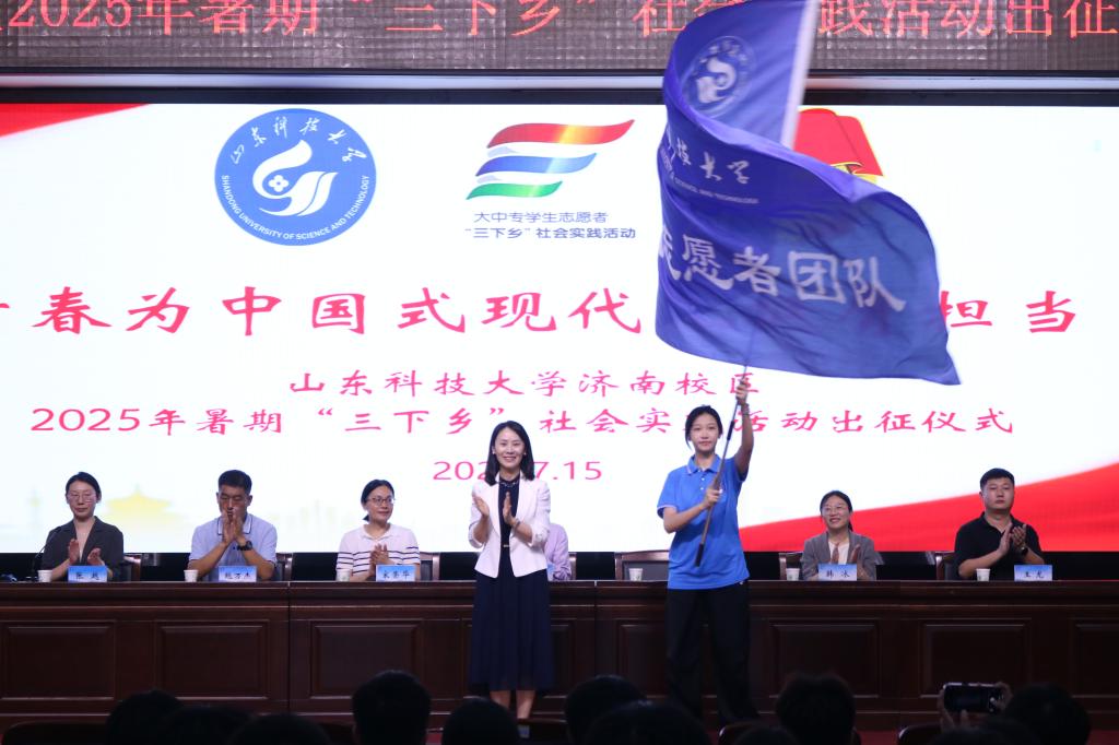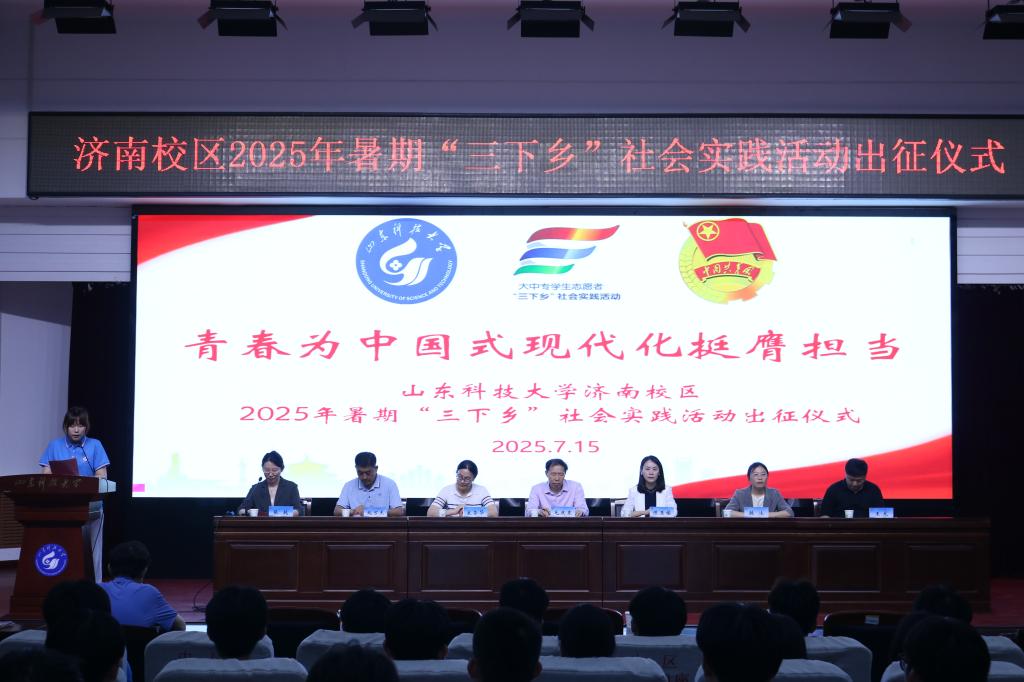 7月15日下午,濟南校區2025年暑期“三下鄉”社會實踐活動出征儀式在圖書館報告廳舉行。共青團天橋區委書記陳亞楠,濟南校區黨委委員、電氣信息系黨總支書記兼學團工作部主任、學生黨總支書記毛慶東出席,校區相關部門負責人、全體學生工作干部及“三下鄉”社會實踐重點團隊師生代表100余人參加。