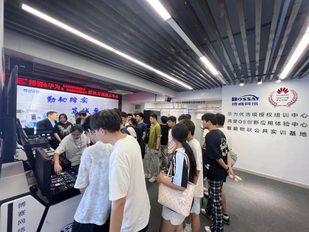 在博賽科技工程師的引導下,學生首先參觀了企業級網絡實驗室。該實驗室配備華為、思科等主流廠商的全套設備,支持運營商級網絡架構仿真。工程師現場演示了路由器配置、安全策略部署及SDN網絡實踐,并重點介紹了紅帽RHCE認證體系與高端網絡人才培養路徑。