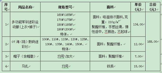 2、軍訓用品費:每生實際應收168元(暫收170元,應退2元),學校統一招標采購,按成本收取。包括以下內容:
