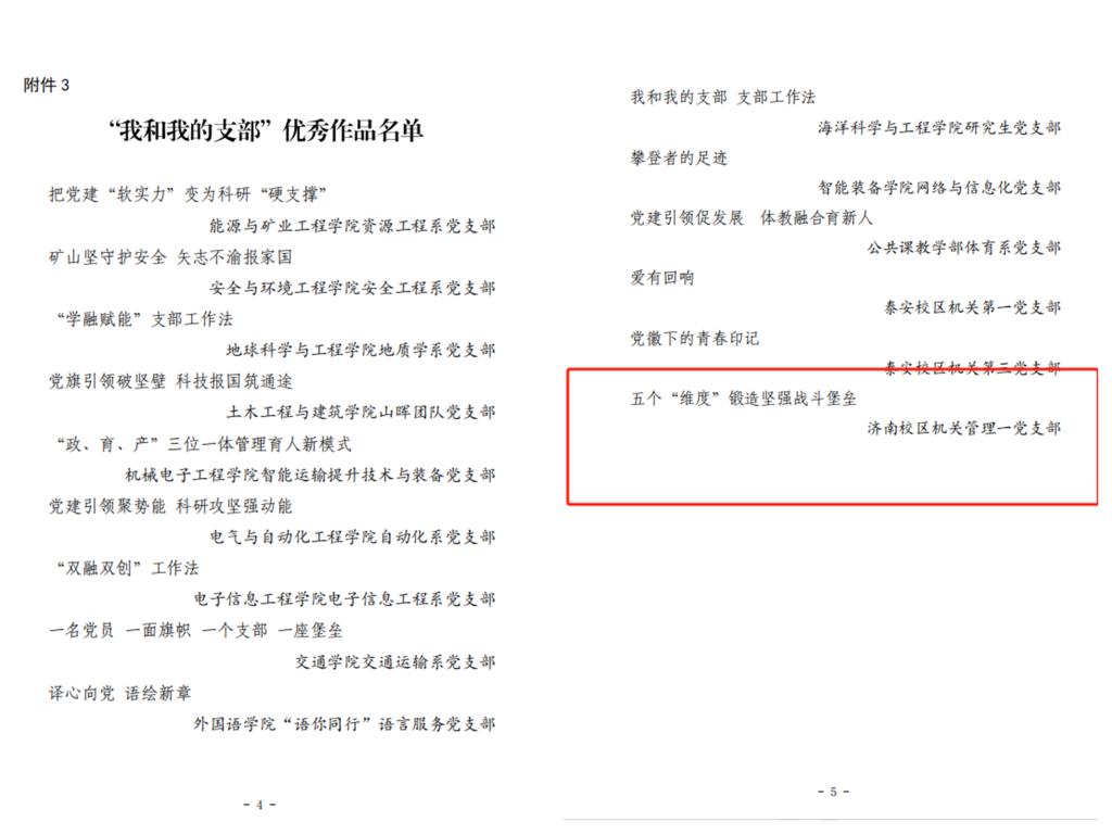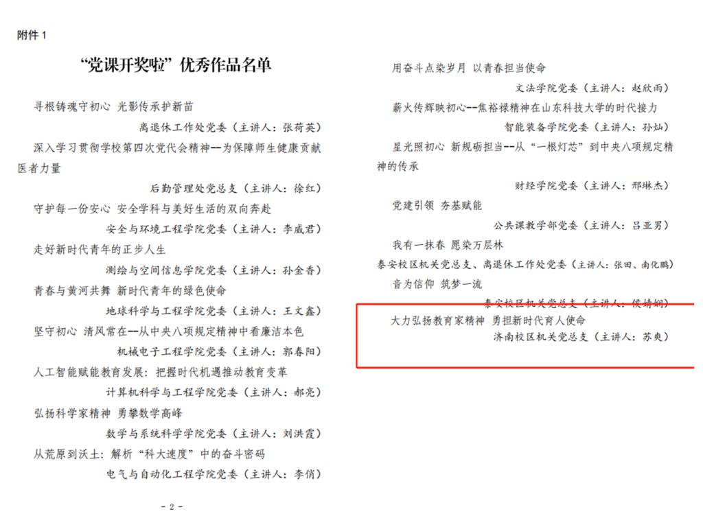 近日,校黨委組織部公布了獲獎(jiǎng)名單,由人文社科系黨支部教師蘇爽主講黨課——《大力弘揚(yáng)教育家精神 勇?lián)聲r(shí)代育人使命》、管理一黨支部報(bào)送的《五個(gè)“維度”鍛造堅(jiān)強(qiáng)戰(zhàn)斗堡壘》獲評(píng)優(yōu)秀作品。