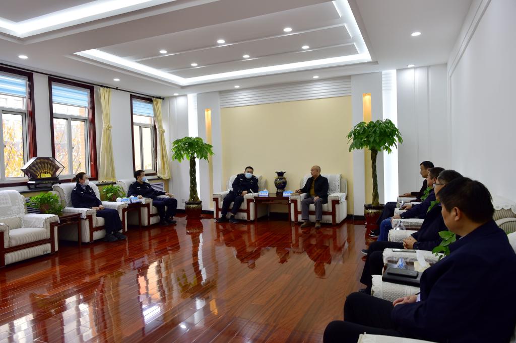 郭加書對楊令宇一行表示熱烈歡迎,對天橋警方長期以來給予校區安全穩定工作的大力支持和幫助表示感謝,介紹了學校的發展歷史與現狀、濟南校區的功能定位與辦學特色、校區學生安全教育管理的做法和成效,希望警校加強溝通交流,進一步建立健全聯防聯動機制,共同維護師生的健康平安和校園的安全穩定,助力“平安濟南” “平安天橋”建設。楊令宇對學校及校區的發展成就表示贊賞,交流了“平安濟南” “平安天橋”建設情況,通報了駐濟學校特別是高校學生安全形勢與狀況,表示要加強與校區的交流溝通,更好地為學校的發展與人才培養提供安全環境保障。